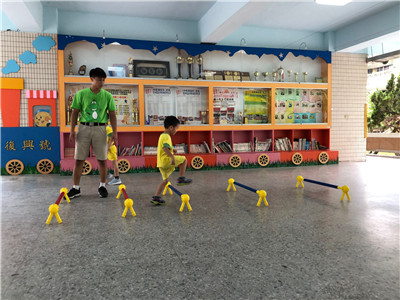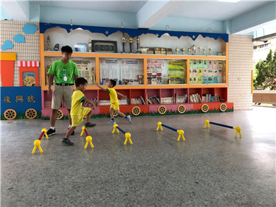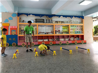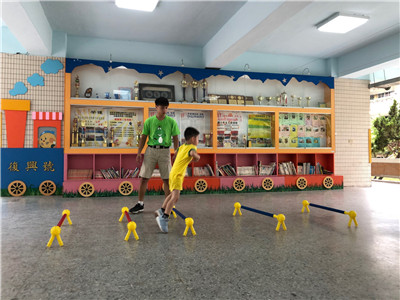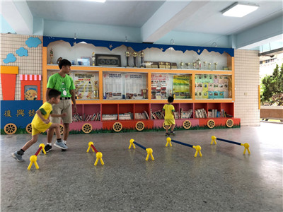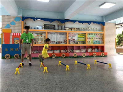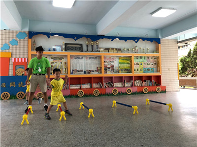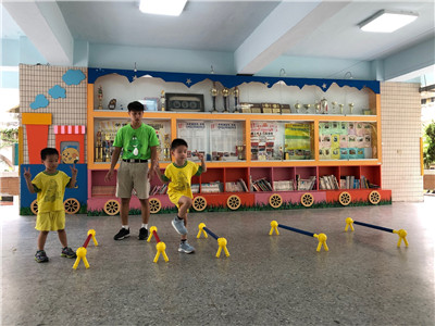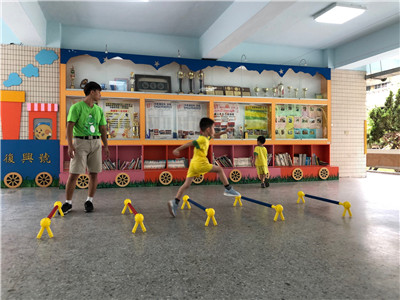 引導:要開始跨欄了!小朋友要像田徑選手一樣,跨過欄架往前跑!